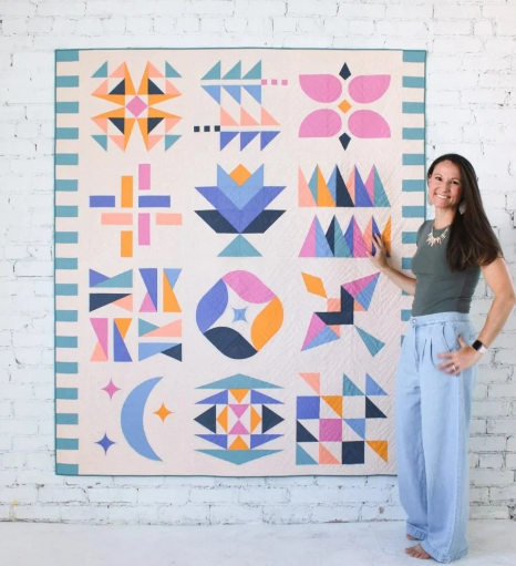 Join quilt designer Brooke of Eudaimonia Studio for an immersive journey that explores the profound connection between mindful making and modern design. This presentation is an invitation to see quilt-making as a practice of intention, where every fabric choice, geometric shape, and composition carries deeper meaning. As Brooke unveils over 20 of her original quilts, she will share the personal stories and philosophical inspirations woven into each one. You’ll get a look behind the curtain of how ancient wisdom and spiritual concepts like wu wei (the art of effortless flow) can inspire a quilt of sweeping curves, and how sharp angles come to symbolize the beauty in brokenness and healing. Through her quilts, you will discover the beauty of experimenting with color, incorporating modern shapes, and playing with scale. Using samples from modern, applique and traditional patterns, she will point out ways the fabric was used and show how they can really make any quilt shout with joy!